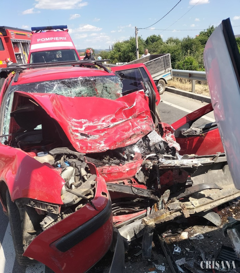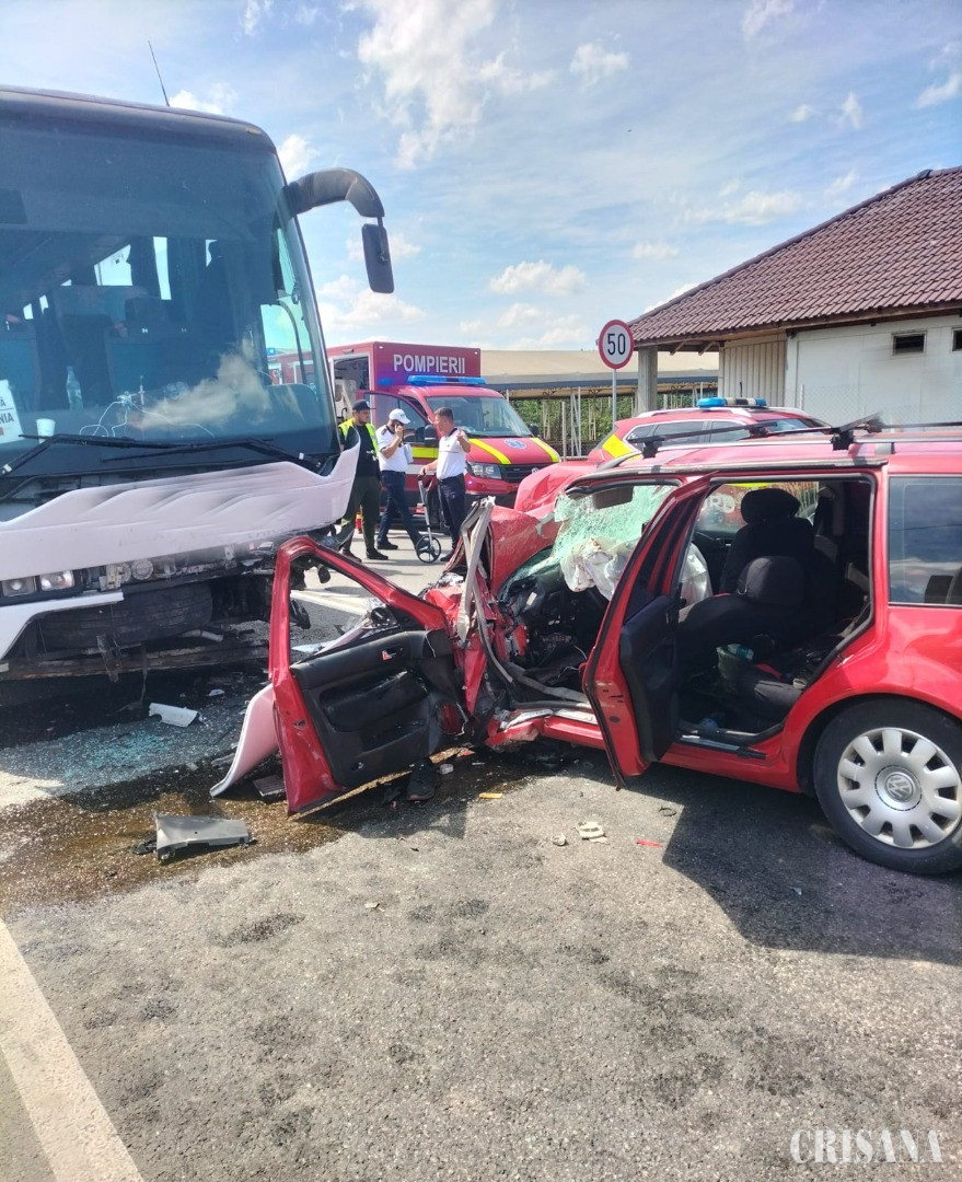 ȘTIREA INIȚIALĂ - Coliziune violentă pe centura Aleșd, județul Bihor, între un autoturism cu patru ocupanți și un autocar cu 10 pasageri. O femeie este resuscitată de echipele medicale, un bărbat zace inconștient, iar un copil de aproximativ șase ani este conștient.