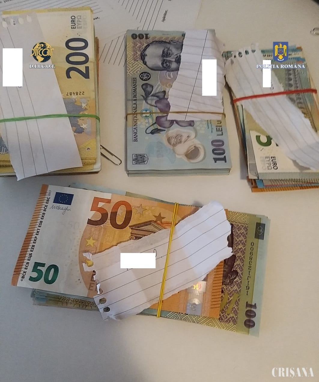De asemenea, în urma celorlalte 3 percheziții domiciliare, efectuate în municipiul Oradea, au fost descoperiți și ridicați 10.945 de euro, 19.800 de lei, cântare electronice de precizie și 4 telefoane mobile.