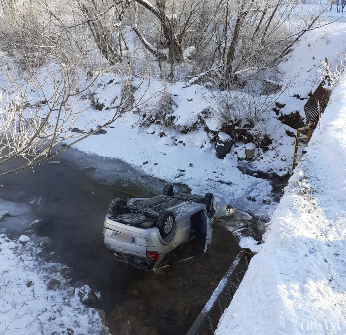 O mașină cu patru persoane a plonjat, luni, într-un râu, după un viraj la dreapta ratat din cauza vitezei şi a drumului înzăpezit. Toți patru au ajuns la spital.