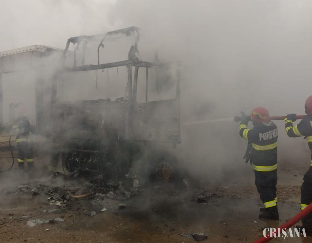 Pompierii orădeni au intervenit, azi, în curtea unei firme situate pe strada Matei Corvin, acolo unde un autocamion a fost cuprins de flăcări.