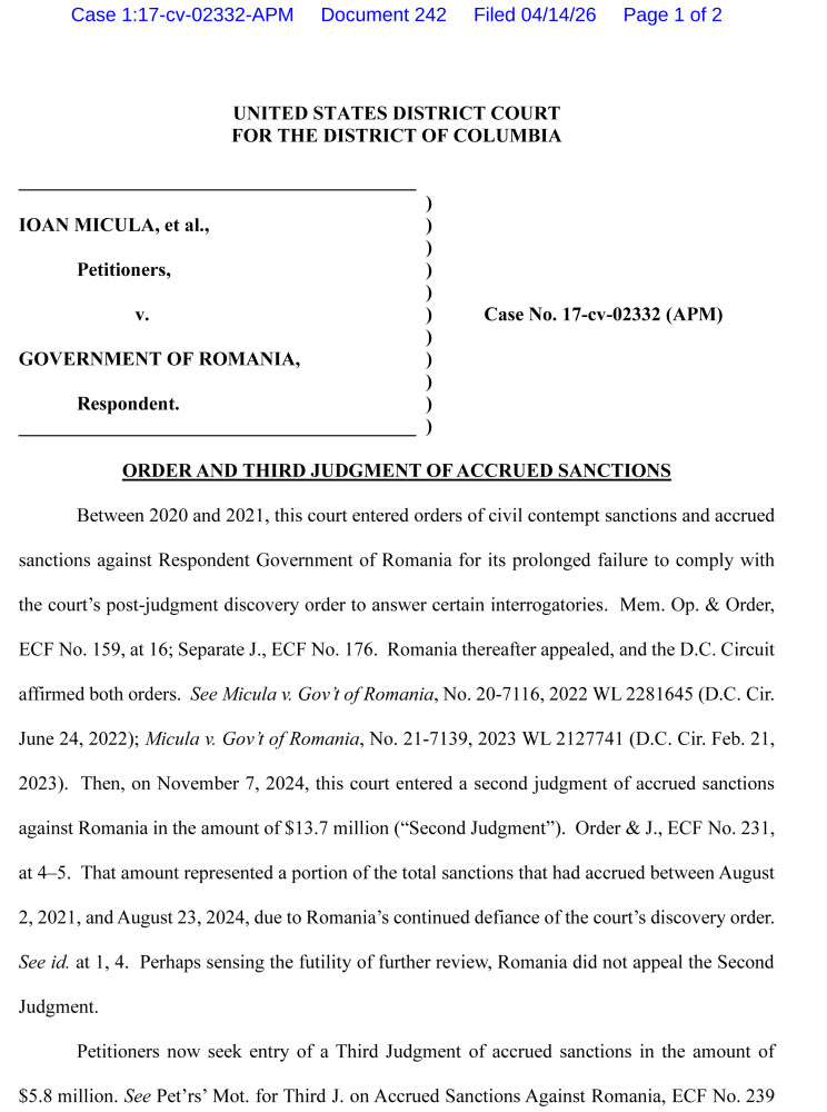 Curtea Districtuală a SUA pentru Districtul Columbia a emis un nou ordin prin care sancționează România pentru nerespectarea continuă a obligațiilor impuse în procesul de executare a hotărârilor din SUA, în care se solicită plata daunelor de peste 356 de milioane de dolari în cazul Micula, confirmând sancțiuni suplimentare și subliniind continuarea executării. Dar problema nu mai este doar despre suma de 356 de milioane de dolari datorată investitorilor. Este, din ce în ce mai clar, despre nerespectarea hotărârilor definitive ale curților din SUA, pe care acestea o califică drept un comportament sfidător ce atrage sancțiuni de 100.000 de dolari/săptămână.