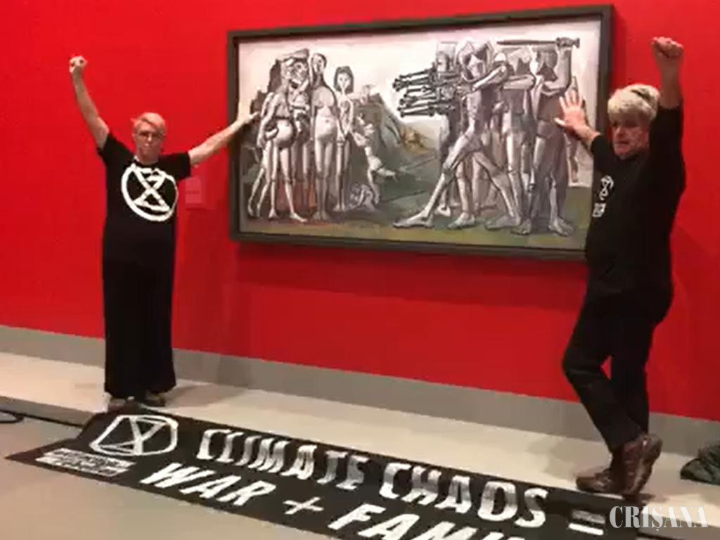 Tabloul lui Pablo Picasso, pictat în 1951, „prezintă ororile războiului", a comentat filiala din Victoria a organizaţiei Extinction Rebellion pe pagina sa de Facebook. „Deteriorarea climei va antrena o accentuare a conflictelor în lume. Acum este momentul ca fiecare şi toate instituţiile să ia atitudine şi să acţioneze!", a îndemnat organizaţia.