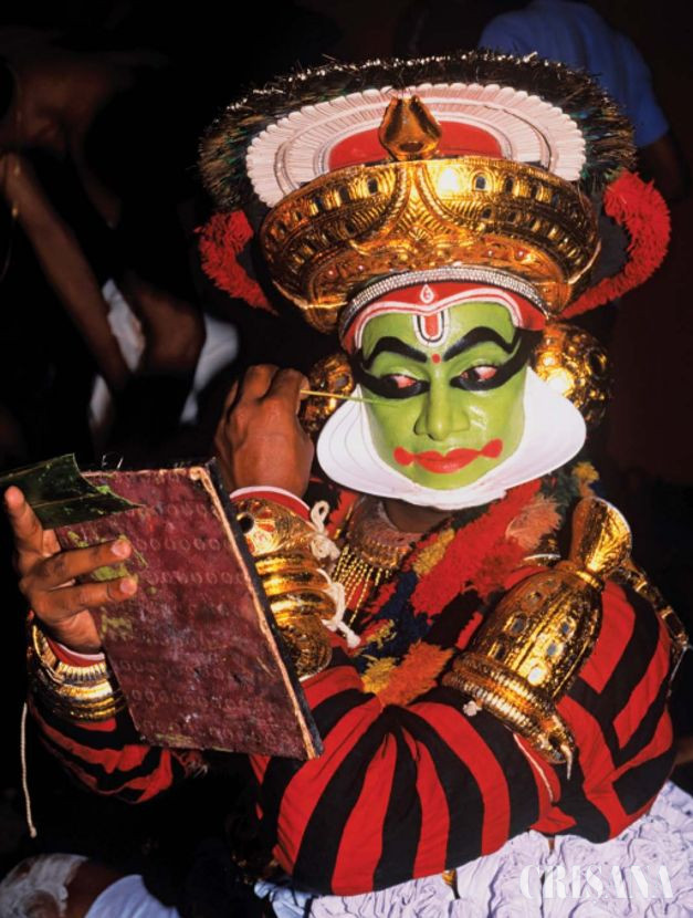 Un artist koodiyattam machiindu-se înainte de un spectacol
