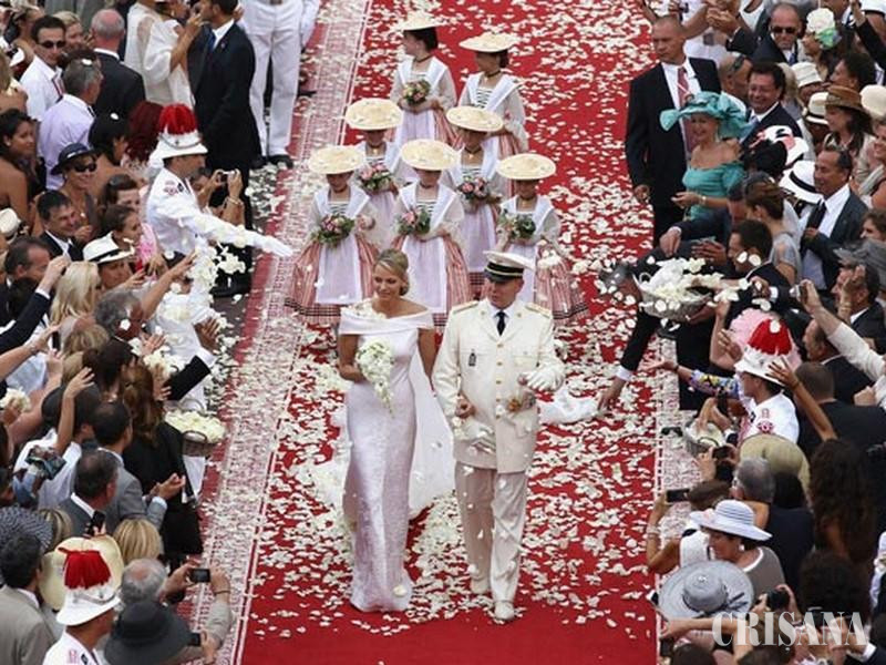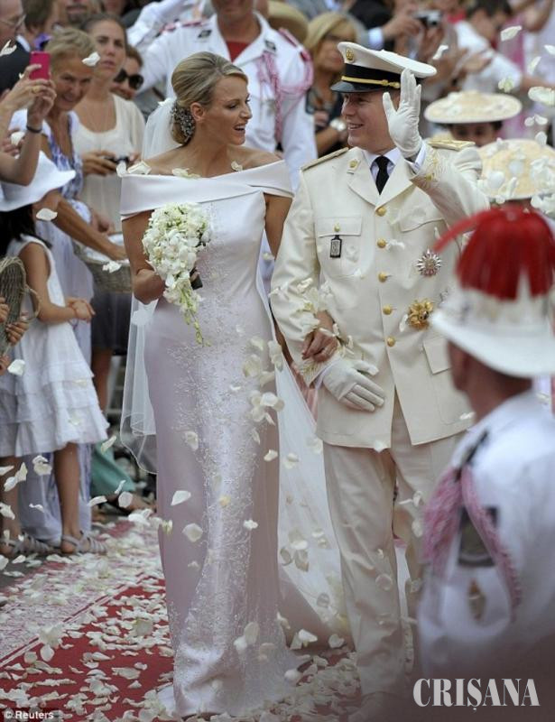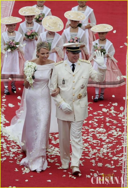 După ceremonia religioasă ce a avut loc sâmbătă în curtea Palatului princiar, transformată în catedrală în aer liber, şi un moment emoţionant la biserica Saint Devote unde prinţesa Charlene, cu lacrimi în ochi, şi-a depus buchetul de mireasă, după cum o cere tradiţia monegască şi cum a făcut şi Grace Kelly, mama lui Albert, înaintea ei, mirii s-au putut bucura de o cină specială şi o petrecere animată. Charlene, care a ales o rochie de mireasă Armani, fără mâneci şi dreaptă, cu o trenă lungă de cinci metri, dar a cărei realizare a presupus o muncă de 2.500 de ore, incluzând brodarea, în motive florale, a 40.000 de cristale Swarowski, 20.000 de perle în formă de lacrimă şi 30.000 de pietre cu nuanţe aurii, povară purtată cu eleganţă de fosta înotătoare, a optat pentru petrecere tot pentru o creaţie a designurului italian. Mai relaxată şi zâmbitoare, ea a apărut seara într-o rochie albă, de muselină de mătase, cu un corset simplu şi cu o fustă cu patru straturi ce picau în valuri, pe care au fost de asemenea cusute cristale fine.