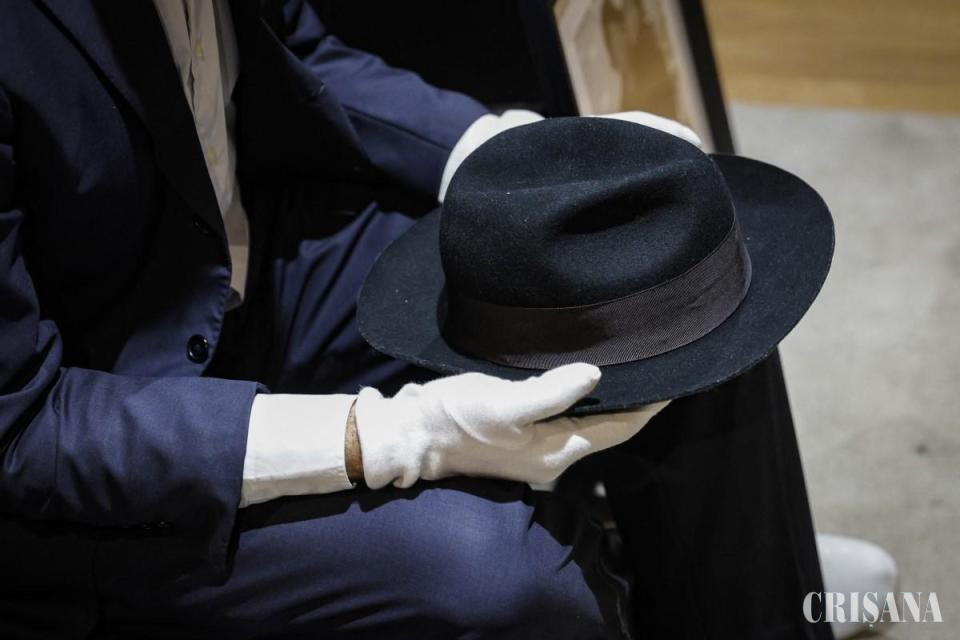 Pălăria din lână căptuşită cu mătase, un model Fedora, estimată între 60.000 şi 100.000 de euro, a fost vedeta licitaţiei organizate de casa Lemon Auction, ce a reunit 200 de obiecte asociate cu industria muzicală.