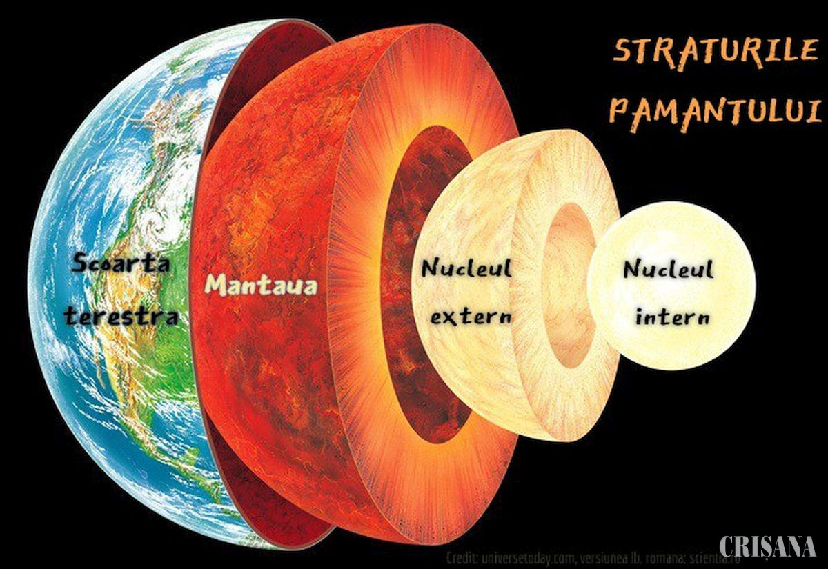 Nucleul intern al Pământului este o sferă aproximativ de dimensiunea Lunii, compusă din fier şi nichel solid, care se află la peste 4.800 de kilometri sub picioarele noastre. El este înconjurat de un nucleu extern - un strat extrem de fierbinte de metale topite, similare cu cele din nucleul intern -, acoperit la rândul său de un strat de roci topite, cunoscut sub numele de manta, deasupra căruia se află scoarţa terestră. Deşi întreaga planetă se învârte în jurul propriei axe, nucleul intern al Terrei poate să se învârtă cu o viteză uşor diferită faţă de manta şi de scoarţă datorită vâscozităţii nucleului extern.
