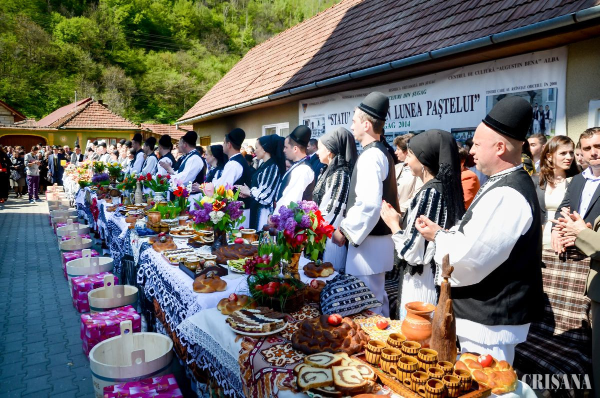 „Statu` la vase”, unul dintre cele mai vechi obiceiuri, unic în România, sărbătorește, în a doua zi de Paști, toate cuplurile căsătorite în ultimele 12 luni, originare din Șugag, județul Alba. Sătenii le aduc vase și lucruri necesare în gospodărie, iar tinerii îi servesc cu bucate tradiționale.