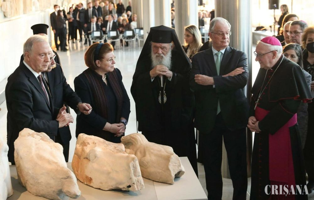 „Restituirea fragmentelor Parthenonului, care au fost păstrate în Muzeele Vaticanului peste două secole, este un gest de prietenie şi solidaritate cu poporul Greciei", a declarat în cursul ceremoniei episcopul Brian Farrell, secretarul pentru promovarea unităţii creştinilor. Este vorba un cap de cal, un cap de băiat şi un cap de bărbat cu barbă, potrivit Muzeelor Vaticanului.