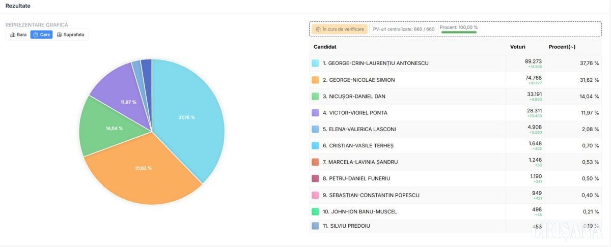 În turul 2 al alegerilor prezidenţiale care vor avea loc duminică, 18 mai, românii vor avea de ales între George Simion și Nicușor Dan. Candidatul AUR a obținut 3.862.403 voturi (40,96%), în timp ce primarul Capitalei a fost votat de 1.979.711 persoane (20,99%). În Bihor, pe primul loc a fost Crin Antonescu, cu 89.273 voturi, (37,76%), fiind urmat de George Simion (AUR) - 74.768 voturi (31,62%).