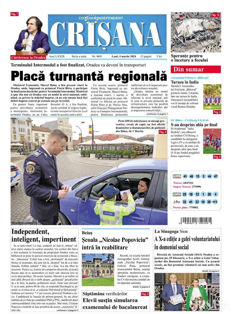 Lucrări la pasajele feroviare de pe străzile Piatra Craiului, Gheorghe Doja și Louis Pasteur - Restricții de circulație Oradea. Lângă podul Dacia, pe strada Averescu - Amenajare peisagistică finalizată Grigore Leșe, vineri seara, la filarmonică - „Un secol de dor” Premii frumoase pentru sorobaniștii orădeni - Olimpiadele mondiale din Dubai Pompierii bihoreni au intervenit în peste 80 de situații de urgență - Incendii, accidente și salvări de persoane O nouă șansă pentru tinerii care ies din sistemul de protecție - Asociația Solidară Emmaus Integrare