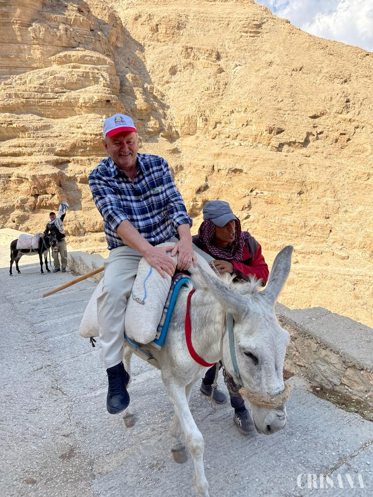 La ieșirea noastră din mânăstirea hozevită, suntem îmbiați de mai mulți beduini să ne transporte contra-cost până sus la tăpșanul de sus unde ne așteaptă autocarul cu șoferul arab Hameed. Când auzim de prețul de 20-25 de dolari, îi refuzăm politicos pe acești navigatori ai deșertului și începem să urcăm aproape pieptiș drumul destul de lung al întoarcerii. Observăm că de sus vin alți beduini care au reușit performanța de a fi cărat pelerini până sus și care încep să ne îmbie stăruitor să renunțăm la amarnica trudă de a urca. Beduinii care au întâlnit de–a lungul anilor atâtea și atâtea grupuri de pelerini români, au început să o rupă binișor pe românește, ba chiar au botezat măgărușii lor cu nume de politicieni români, de la președinte de stat, până la miniștri și ministrese, spre hazul neascuns al pelerinilor. Interesul poartă fesul! Recursul la politică dă roade în pustia Hozevei! Pentru că pelerinii fac haz de necaz și sunt și câțiva care se declară de acord să încalece, în sfârșit, pe politicienii români! Dacă pe urcușul din pustiu intri în vorbă cu beduinul, ai dat de belea! Te urmează docil, lângă măgăruș, tocmindu-se întruna cu tine și mai scăzând din preț pe măsură ce urci. Toți se plâng că sunt săraci, că au familii numeroase, astfel că mereu canonesc măgarii cu suitul și coborâtul în nădejdea de a cumpăra o cămilă, o corabie a deșertului. Așa am pățit și eu: din curiozitate am intrat în vorbă cu un beduin care s-a ținut scai de mine și de fiul meu pe drumul de întoarcere. Beduinul a judecat bine, văzând că sunt nins pe cap și că respir din ce în ce mai greu pe căldură, ars de soarele nemilos și fără putință de a da de vreun petec de umbră în acest marș suitor și epuizant. În cele din urmă, am cedat, inima îmi bătea nebunește în piept și mi-am zis în sine că am făcut rău că nu am văzut Țara Sfântă pe vremea când eram mai tânăr și în putere. Învingător și răbduriu, beduinul a tras măgărușul alb lângă o ieșitură din stâncă și de acolo, ajutat de fiul meu Theodor, am încălecat pe măgărușul de care mi-a fost milă, având în vedere greutatea mea. Asinus asinum fricat!, mi-am zis, amintindu-mi de o butadă mereu spusă de magistrul meu de limba latină de la Beiuș: Măgariul pre măgariu scarpină! Am uitat să vă spun că la ieșirea din mânăstire o femeie corpolentă din alt grup de pelerini români mi-a destăinut faptul că în anii trecuți a fost refuzată de beduini să urce pe măgarii lor din cauza greutății sale de aproape 130 de kilograme! De atunci, femeia a slăbit, numai și numai de dragul Țării Sfinte pe care continuă să o viziteze pentru a se închina la locurile sfinte. Pe drumul de întoarcere, beduinul tânăr, mărunt și negricios, ars de soare, mi se plânge mereu că e foarte sărac și că are patru copii și că visul lui este de a cumpăra o cămilă să poată birui sărăcia. Îl întreb în engleză cât costă o cămilă și îmi răspunde că în jur de vreo 40.000 de dinari, adică în jur de 10.000 de dolari. Dar cât costă un măgar? - îl mai întreb eu. În jur de 1.000 de dolari, îmi răspunde el. Mi s-a făcut milă de beduin și am coborât cu toate protestele fiului meu. Am plătit 15 dolari și am mai adăugat de la mine 5 dolari și am văzut un beduin fericit care mi-a mulțumit cu mâna la inimă și apoi a luat măgărușul de căpăstru spre a coborî în vale să care alți pelerini români în vârstă. Cât despre mine ce să vă mai spun? Rămas fără mijloc de locomoție patrupedă, cu puțin efort și pauze mai multe, ajutat de fiul meu Theodor, am reușit să ajung la tăpșanul de sus, unde ne aștepta autocarul. Ne-am oprit la o tarabă unde am băut cea mai grozavă și bună băutură din lume la ora aceea: un suc de rodii la fel de bine venit în pustia încinsă precum un nectar al zeilor!