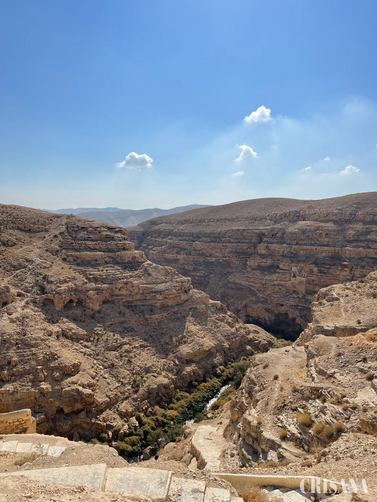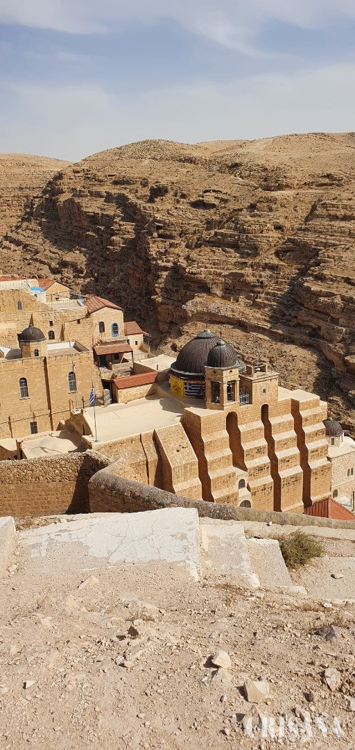 A treia zi, 10 noiembrie 2022. După agapa prietenească a pelerinilor a urmat parcă în chip firesc un episod de postire și nevoință printr-o nouă deplasare spre un alt areal din pustia Iudeii unde străjuiește mânăstirea Sfântului Sava cel Sfințit (în grecește Aghios Sabba). Semnificația pustiei, a deșertului, a locului lipsit cu totul de vegetație este întâlnită pe tot cuprinsul Scripturii. După ce au părăsit Egiptul cel bogat, adăpat din belșug de apele Nilului care întinde peste câmpuri mâlul cel roditor pentru două recolte pe an, vechii iudei au trecut în mod miraculos apele Mării Roșii, dar greutatea drumului abia începea. Poporul ales a fost încercat de Domnul așa cum focul încearcă și purifică aurul și argintul, îndepărtând zgura netrebuincioasă și pentru a străluci în toată puterea. Focul purificator s-a dovedit căldura zilelor și frigul nopților din pustiu, setea și foamea, însingurarea, sentimentul de nesiguranță, idolatria, toate trăite pe viu prin nemărginirea cumplit de pustie a Peninsulei Sinai, mărginită de Golful Suez și Golful Aqaba și separată de Marea cea Mare (Marea Mediterană) de ținutul neprietenos și nisipos al filistenilor și care făcea legătura terestră între Egiptul marilor faraoni și Palestina, prin zone alcătuite din granit tare, gresie și alte roci dure, pentru că pe două din aceste roci dure din Munții Sinaiului se va fi scris cele zece porunci ale lui Dumnezeu și ale umanității întregi. Când iudeii au părăsit Egiptul, se crede ca au fost în număr de circa 600.000 de bărbați în afară de familiile lor, astfel că numărul total al imigranților biblici ar fi ajuns în jur de 2 milioane de suflete. Ei nu au mărșăluit în coloane lungi de câte patru, cum s-ar crede, de-a lungul și de-a latul Peninsulei Sinai, ci se stabileau în văi mici și grupați pe familii și seminții, ajutându-se între ei cu rezervele de apă. Perioada eroică a Exodului și a drumului prin deșert a însemnat din punct de vedere teologic un simbol, un destin, o călăuzire divină, o împlinire a unui vis, un simbol al providenței divine, dar și al naturii răzvrătite a omului, întruchipate de episoadele de cârtire, de recădere în idolatrie, de lăcomie, de răscoală împotriva lui Moise, a fost un drum al calvarului, de căutare înfrigurată a unui liman, a țării promise de Dumnezeu. Morala ar fi aceea că nu poți ajunge în țara unde curge lapte și miere, fără imense sacrificii, nu poți atinge cerul divin fără a fi mai întâi cufundat în râpele dezgustătoare ale iadului de pe pământ. Cum ne-am făcut ucenicia cu drumul din pustia Hozevei, suntem acum obișnuiți să vedem și alte locuri pustii, neprietenoase, printre care se înalță doar colții ascuțiți ai stâncilor de tot felul. Am ajuns cu autocarul condus de arabul Hameed pe un tăpșan înalt de unde ne îmbarcăm imediat în mai multe microbuze conduse de șoferi pricepuți să ne ducă în jos spre o vale adâncă, valea Chedron (care coboară de la Ierusalim și se varsă în Marea Moartă) pe niște drumuri înguste, periculoase, abrupte și aflate pe buza prăpăstiilor până în apropiere de Mânăsirea Sfântului Sava cel Sfințit. Intrăm în mânăstire printr-o ușă foarte îngustă și joasă, încât ne aplecăm capetele, iar femeile rămân afară, nu li se permite accesul, întocmai regulilor care se întâlnesc și pe cuprinsul Sfântului Munte Athos și Mânăstirii Frăsinei de la noi. Femeile pot să vadă mânăstirea de sus, din Turnul femeilor care este situat pe partea înaltă a colinei din dreapta mânăstirii și unde a stat odinioară însăși mama Sfântului Sava, neputând să-l vadă pe fiul ei, pentru a nu se încălca regula monahală strict statornicită.