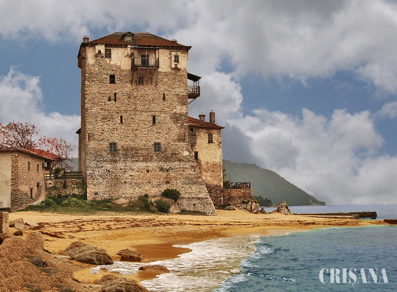 După ce am băut ceai aromat şi cafea, la fel de fierbinţi şi binevenite, tăifăsuind uimiţi despre nemaipomenita schimbare a vremii, adunaţi lângă părintele nostru Ambrozie, ne-am îndreptat cu toţii spre cheiul de lângă emblematicul turn bizantin Prosphori, unde urma să vină ferry-boat-ul. Turnul de langă ţărm a fost ridicat în secolul al XIV-lea prin strădania monahilor din mânăstirea Vatopedu. El a fost incendiat pe vremea revoluţiei greceşti din 1821 de către turci şi restaurat după 1865, cu adăugarea unei prese de stoarcere a măslinelor, a unui cuptor, a unor grajduri, a unui atelier de fierărie şi a două clădiri pentru muncitori, iar azi se mai păstrează doar turnul impresionant, atelierul de fierărit şi casele foştilor lucrători de pe vremuri. După războiul greco-turc, în cadrul schimburilor de populaţie, în 1922, dintre Grecia şi Turcia, guvernul elen a confiscat domeniul mânăstiresc din jurul turnului pentru a-i găzdui aici pe refugiaţii greci din Asia Mică, din Caesaria şi Propontida. Aici, pe ţărm, în fostele clădiri mânăstireşti abandonate au locuit negustorii şi ţesătorii de covoare greci până au reuşit să-şi ridice propriile lor case. Intrarea în vestitul turn se face printr-o curte exterioară trecând de o uşă masivă de lemn, bătută zdravăn în ţinte metalice. O scară de temut, abruptă, urcă spre etajele superioare, unde se obsevă cum două balcoane din lemn stau agăţate într-o poziţie periculoasă, de-a dreptul precară, de zidurile exterioare, sprijinite pe nişte bârne mâncate de vreme. Sus, o capelă de mici dimensiuni îi aşteaptă pe pelerini, prilej de admirare a vulturului bizantin cu două capete, săpat în piatra de la etaj, lucru ce demonstrează îndeajuns vârsta acestei clădiri pe care o păstrezi pe retină şi când te duci spre Sfântul Munte şi când te întorci de acolo...