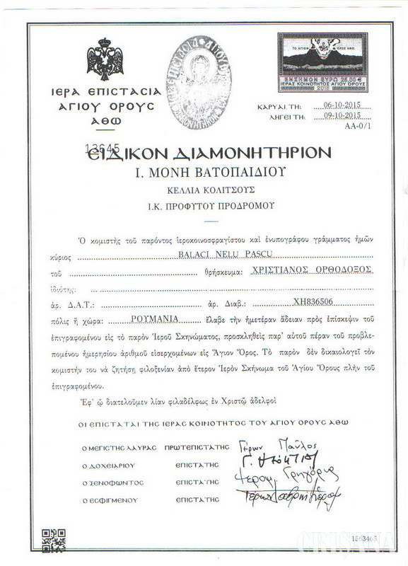 Expresia grecească Axion estin... înseamnă Cuvine-se cu adevărat... și ea este începutul minunatei cântări de slavă închinate Maicii Domnului, dezvăluite de arhanghelul Gavriil unui novice călugăr: „Cuvine-se cu adevărat să te fericim pe tine Născătoare de Dumnezeu, cea pururea fericită și preanevinovată și maica Dumnezeului nostru” și de atunci icoana Fecioarei botezată cu acest nume, aflată în biserica Protaton din Kareya, capitala Muntelui Athos, a devenit una din cele mai prețioase şi venerate icoane ale ortodoxiei, ea fiind și cea mai veche din toată republica monastică. Pelerinii, cei mai mulți, cu ranițe în spate trec peste puntea lată metalică a ferry-boat-ului și așteaptă cuminți cu diamonitirion-ul în mână. Ne așezăm și noi la rând, să fim verificați de cerberul grec de pe ambarcațiune. Desfășor curios sulul de hârtie aurie înaintea ochilor. Este scris în întregime în limba greacă, stânga sus se vede emblema Muntelui Athos, la mijloc o icoană sferică alungită a Maicii Domnului și în dreapta un timbru reprezentând un munte despicat în două într-un fel de gură de vulcan de unde se înalță o trâmbă de nori cu imaginea Fecioarei. Numărul de înregistrare al diamonitirionului meu este 13645 și este eliberat în data de 06.10.2015 cu valabilitate până în 09.10.2015, cu numele tipărit cu majuscule BALACI NELU PASCU, iar din noianul de propoziții grecești descifrez doar Cristianos Ortodoxos din Romania (POYMANIA), cu semnăturile manu propria ale celor patru împuterniciți (epistați) de la mânăstirile Marea Lavră, Dochiariu, Xenofont și Esfigmenu. Pe verso, este tipărit un text tot în grecește, cu un număr de l2 puncte, probabil indicații de urmat în Sfântul Munte. Din 2006, taxa de eliberare a unui diamonitirion este de 35 de euro. Niciun cuvânt, unul măcar, în limba engleză, franceză sau germană.