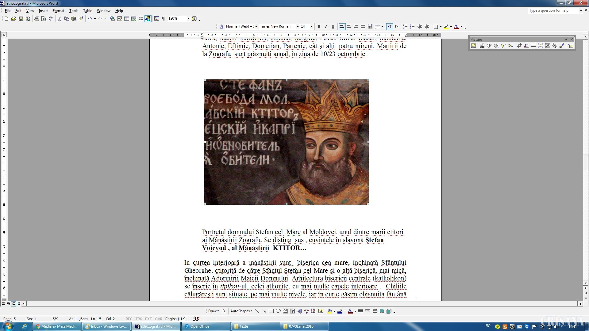 Un călugăr, pe nume Isaia, de la mânăstirea Hilandar, spunea, pe la anul 1489 că Zografu a fost înfiinţată de Sfântul Ştefan cel Mare al Moldovei. Aici ni se confirmă faptul de netăgăduit că mânastirea Zografu a fost re-întemeiată, practic în întregime, în secolul al XV-lea, de către viteazul voievod. Am văzut cu toţii turnul clopotniţă, arsanaua (portul) mânăstirii, şirul de chilii, trapeza, incinta, biserica şi chiar pictura ei, toate refăcute de domnitorul declarat sfânt al Neamului Românesc. El a iubit atât de mult mânăstirea athonită Zografu, încât adesea spunea „a noastră mânăstire”. Daniile marelui învingător în lupta cu turcii au fost nenumărate, astfel că am putut să-I privim chipul în biserica cea mare a mânăstirii. Dar el a mai ajutat şi lăcaşurile monastic de la Vatopedu, Grigoriu, Costamonitu, Sfântul Pavel, dovada fiind pisaniile şi reprezentările lui iconice de aici, în calitate de ctitor.