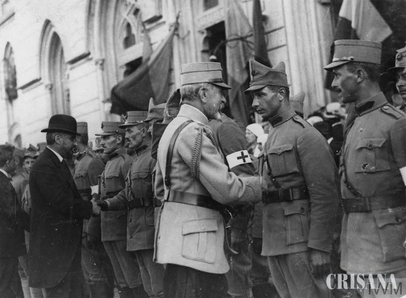 1. Generalul Prezan salutând ofiţerii transilvăneni care s-au alăturat armatei române, Iaşi 1917. În planul secund, primul ministru Ionel I.C. Brătianu