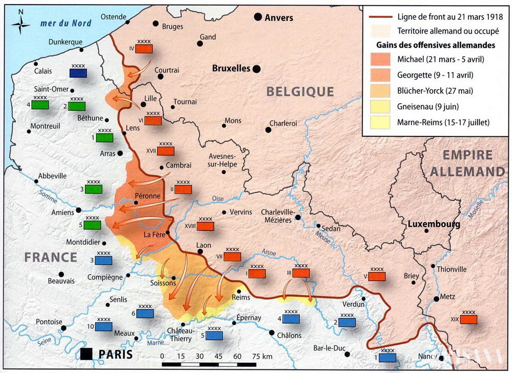 Şeful de stat major al Înaltului Comandament German (OHL), generalul Erich Ludendorff, a dezvoltat planurile pentru operațiunea numită „Michael”, ca o ofensivă generală de-a lungul Frontului de Vest. Ofensiva de primăvară (Kaiserschlacht) avea scopul să despartă forțele britanice și franceze printr-o serie de avansări şi învăluiri. Comandamentul german spera să lanseze un atac hotărâtor înainte ca forțele americane, care soseau în număr mare de peste ocean, să fie gata pentru luptă. Înainte de începutul ofensivei, Ludendorff a făcut însă o greșeală crucială, lăsând partea principală a Armatei a VIII-a germane în Rusia și mutând doar o parte mică a forțelor germane pe Frontul de Vest.