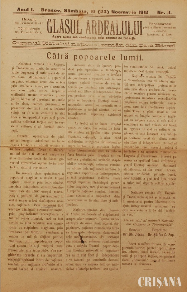 Profesorul Ilie Cristea, originar din sudul Bihorului, exprima - în finalul broşurii Glasul Ardealului - punctul de vedere al social-democraţilor români din Transilvania şi Ungaria referitor la crezul lor cel mai puternic: "instinctul nostru (al social-democraţilor) ne îndeamnă să strigăm în lumea largă că neamul românesc ... vrea Unirea sa desăvârşită într-un singur stat naţional românesc unitar şi independent”.