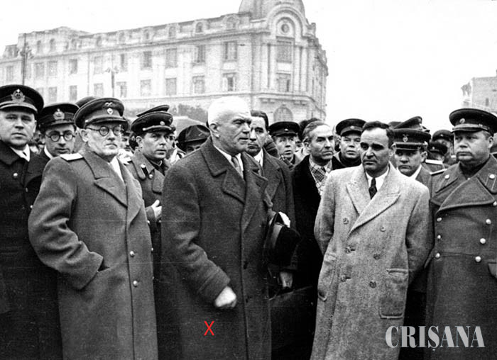14 martie 1945, întoarcerea în Capitală a membrilor guvernului care au participat la festivităţile organizate cu prilejul reunirii Nordului Transilvaniei cu România democratică. Piaţa Gării de Nord: A.I.Vişinschi, Petru Groza - marcat cu X - Gh. Gheorghiu Dej, general Susaikov, Gh. Tătărescu, P.Constantinescu Iaşi. Credit: fototeca.iiccmer.ro