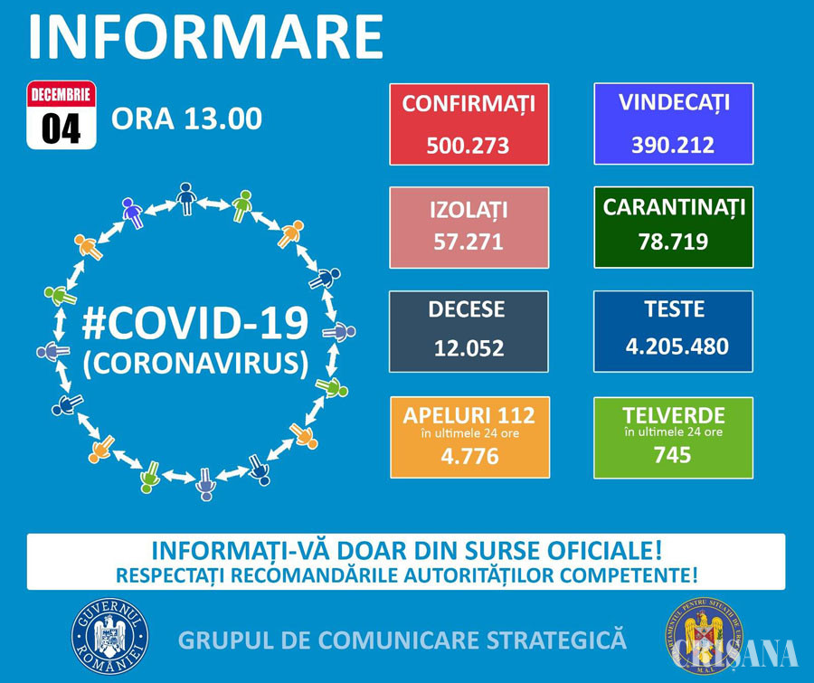 Coeficientul infectărilor cumulate la 14 zile, raportate la 1.000 de locuitori, calculat de către Direcțiile de Sănătate Publică ale județelor pentru ziua de vineri, 4 decembrie, este următorul: Constanța – 7.04, Ilfov – 7.01, Cluj – 5.74, Sibiu – 5.42, București – 5.39, Brașov – 5.19, Arad – 4.71, Argeș – 4.67, Alba – 4.24, Timiș - 4,03, Bihor – 3.41 (o creștere cu 0.35 față de joi).