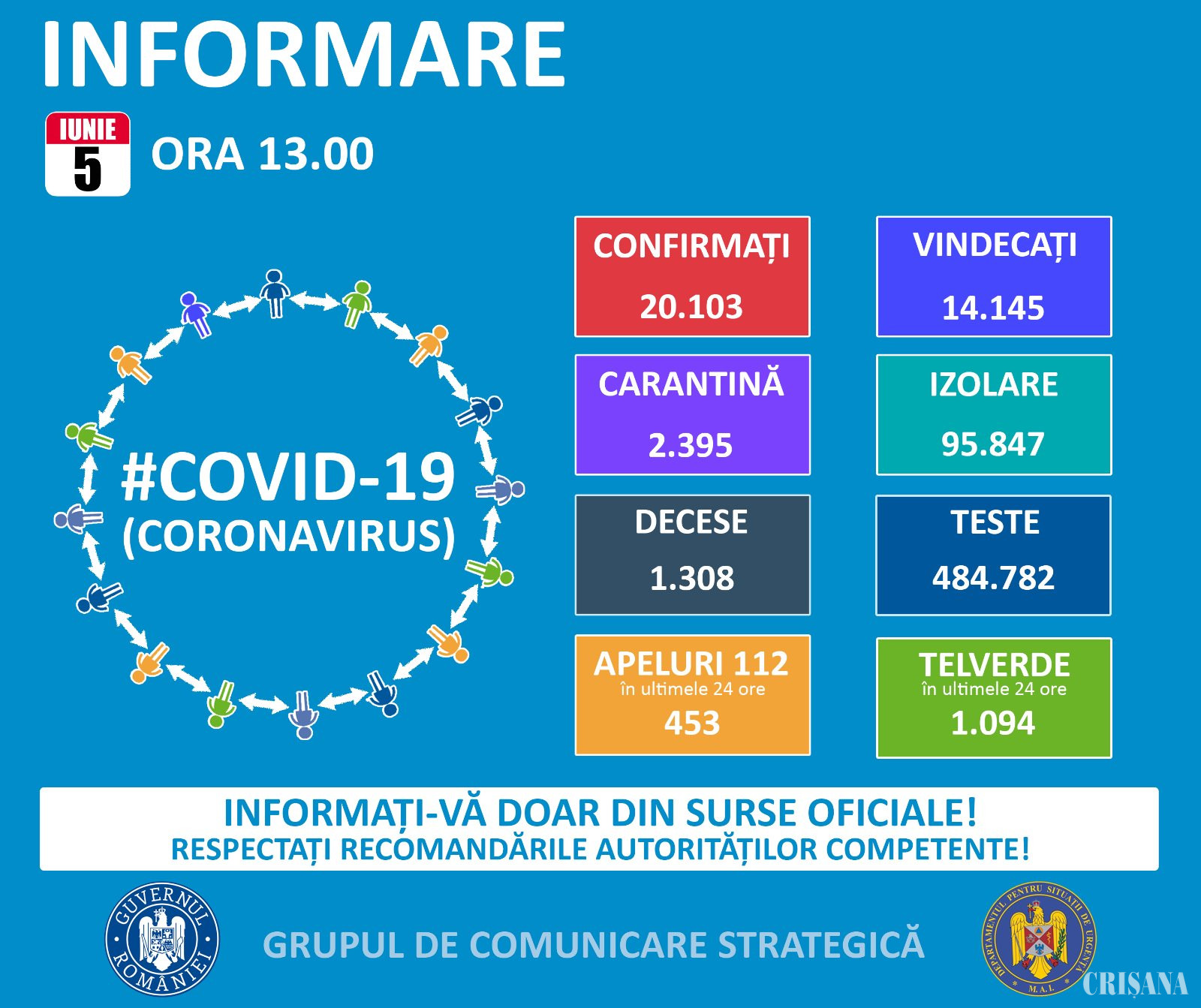 La nivel național, din 484.782 de teste prelucrate, numărul persoanelor infectate a ajuns la 20.103, cu 14.145 de persoane declarate vindecate și externate. Față de joi, vineri s-au identificat 196 de cazuri noi de îmbolnăvire (cu 42 mai puține).