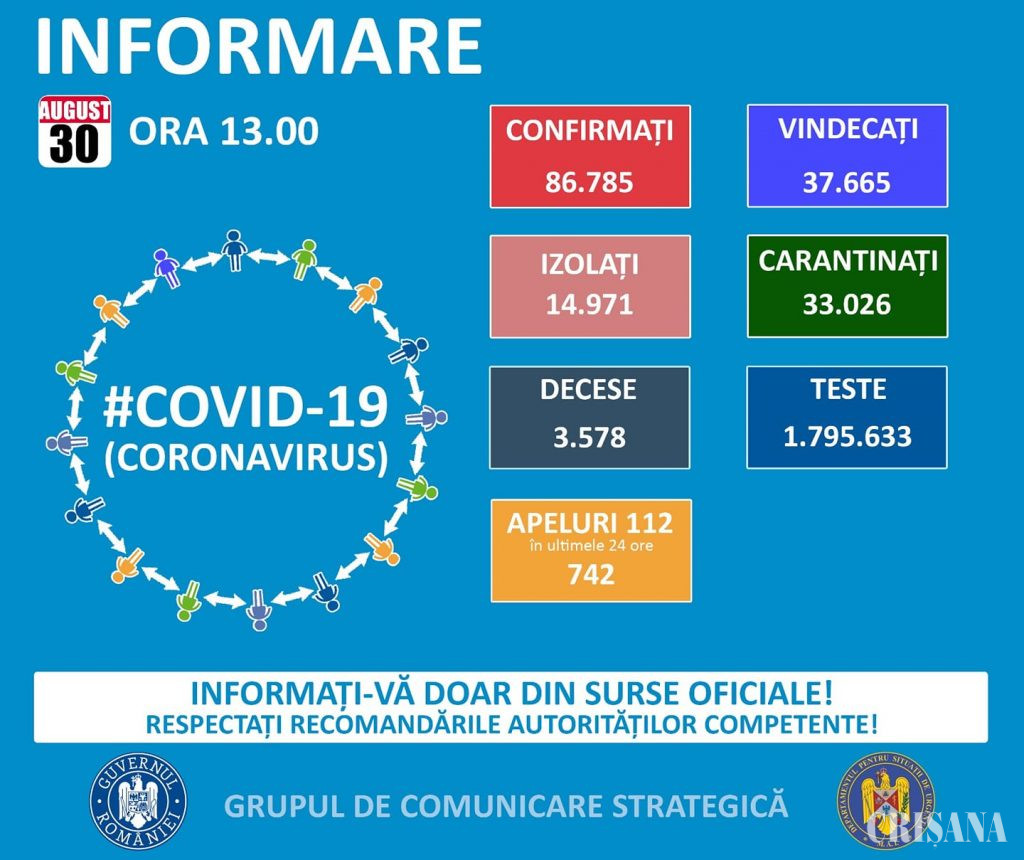 Până duminică, 30 august, pe teritoriul României, au fost confirmate 86.785 de cazuri de persoane infectate cu noul coronavirus (Covid-19), dintre care 2.322 sunt din Bihor, de la începutul pandemiei.
