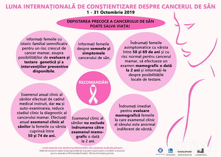 Direcția de Sănătate Publică Bihor desfășoară, în luna octombrie, o campanie de informare, educare și comunicare, cu scopul de a crește atenția și gradul de conștientizare al populației privind prevenirea și depistarea precoce a cancerului de sân.