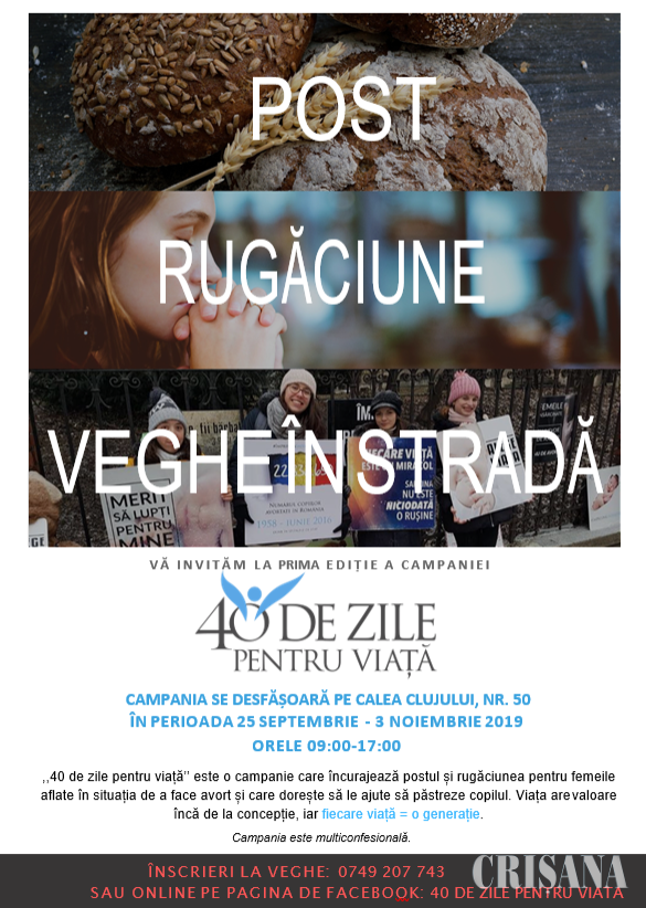 Bihorenii se vor uni în post, rugăciune și veghe pașnică pentru încetarea avorturilor. Campania se desfășoară în fața Maternității, pe str. Calea Clujului, nr. 50, în perioada 25 septembrie – 3 noiembrie, între orele 9.00 – 17.00.