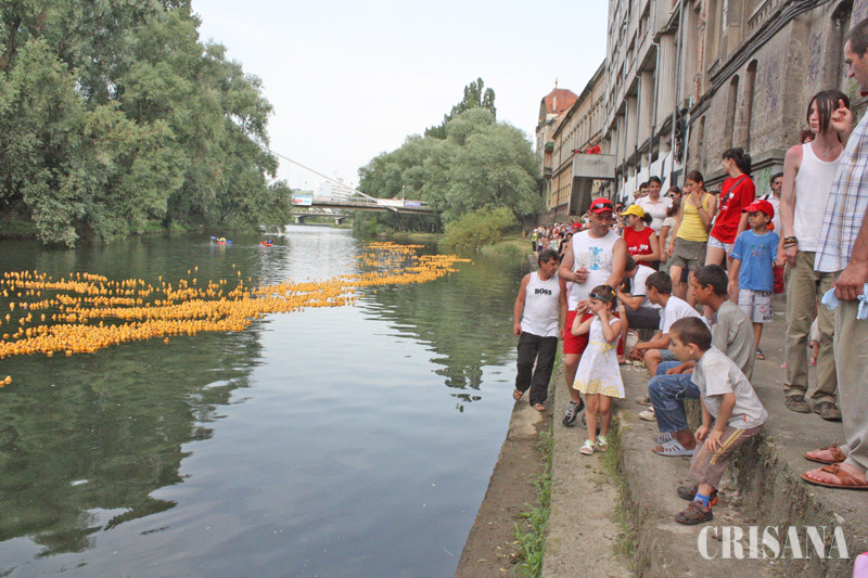 Mult aşteptatul moment, acela de a vedea raţele la întrecere, s-a petrecut în jurul orei 17.00, când de pe Podul Intelectualilor au fost lansate în apă 5000 de răţuşte. Fiecare dintre acestea avea înseriat un număr ce corespundea biletului cumpărat la tombolă de către orădeni. Zeci de minute convoiul galben a parcurs traseul de la punctul de plecare până aproape de Podul Ferdinand, iar prima care a trecut linia de sosire i-a adus celui care a adoptat-o 1500 de lei. Şi următoarele au fost câştigătoare, organizatorii pregătind peste 30 de premii ce au costat în mobilă de tineret, canapea, role, vouchere, etc. "Au fost acordate peste 30 de premii care au adus bucurie în special în rândul copiilor şi nu neapărat pentru valoarea acestora, ci pentru faptul că au avut ocazia să participe. Prin organizarea evenimentului am dorit să promovăm spiritul de familie, oamenii să fie încurajaţi să petreacă mai mult timp alături de cei dragi. Părinţii şi bunicii au fost invitaţi să îi ia pe cei mici de mână şi să vină pe malul Crişului şi să petreacă împreună. În esenţă ne-am dorit să bucurăm sufletele celor care cred în familie şi nu în ultimul rând să sprijnim centrele de zi orădene reunite în Asociaţia Evantai, unde vor merge banii obţinuţi din vânzarea biletelor.", ne-a declarat părintele Laurenţiu Lazăr, organizator din partea Episcopiei Ortodoxe.