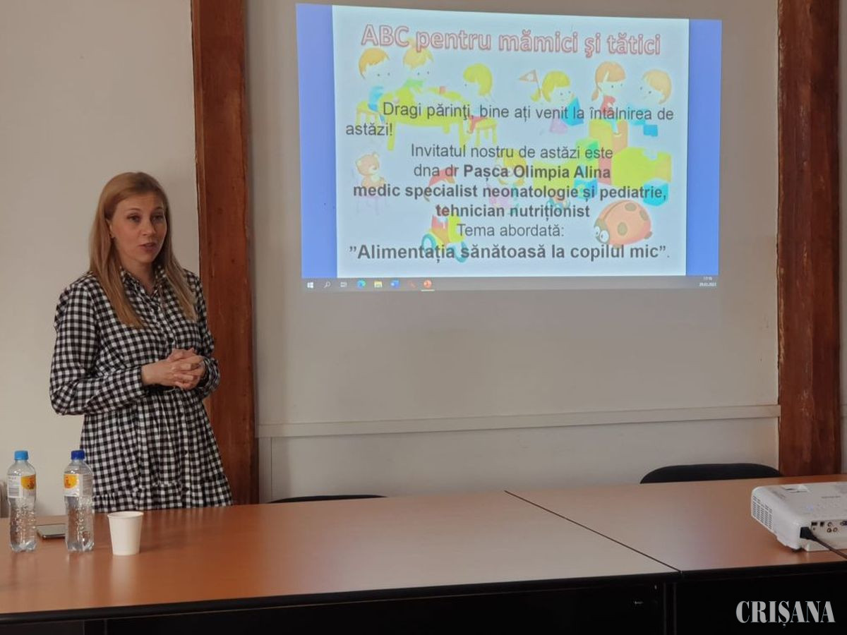 Invitatul special al întâlnirii a fost doctor Olimpia Alina Pașca, medic specialist pediatrie, neonatologie, tehnician nutriționist, care le-a vorbit părinților despre importanța Alimentației copilului mic.
