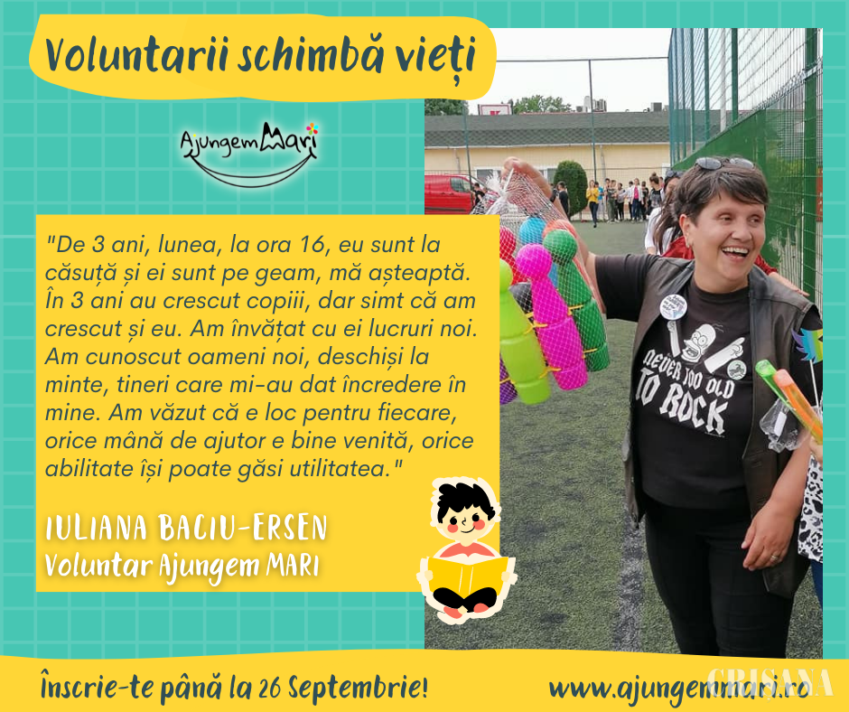 „Aveam copii, construisem o casă, plantasem un pom, mai lipsea să fac ceva care să conteze în viața cuiva. Așa am ajuns să fac voluntariat. Prima experiență a fost prin prietenii mei, motocicliștii de la o organizație umanitară, alături de care am turnat fundațiile a 40 de case, în Bacău. În scurt timp a apărut o campanie de recrutare pentru voluntari Ajungem MARI și am aplicat grație încurajărilor copiilor mei... La 17 ani, după ce am deschis lista de dorințe, acum trec pe ea planuri pentru copii, la ce cursuri îi înscriu, cine are nevoie de pregătire, unde mergem în vacanță. Emoția întâlnirii cu copiii încălzește inima oricui. Orice pas făcut alături de un copil înseamnă un viitor adult echilibrat, încrezător în el și în cei din jur, lucru de care ei au mare nevoie. Cu cât mai mulți voluntari, cu atât mai mulți astfel de adulți”, mai spune femeia.