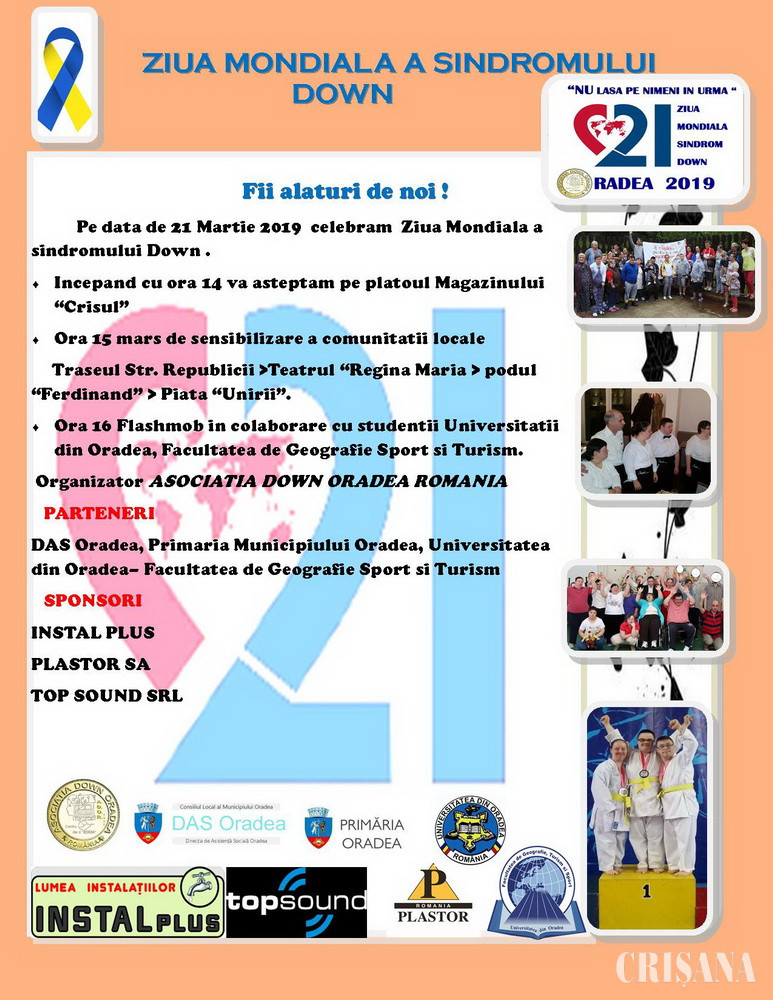 Ziua Mondială a Sindromului Down va fi marcată astăzi, 21 martie, la Oradea, printr-un marș, cu pornire din fața Magazinului Crișul, urmat de un flashmob, în Piața Unirii. La eveniment sunt invitate peste 200 de persoane cu dizabilități, membrii de familie ai acestora, personalități locale, dar și simpli cetățeni.
