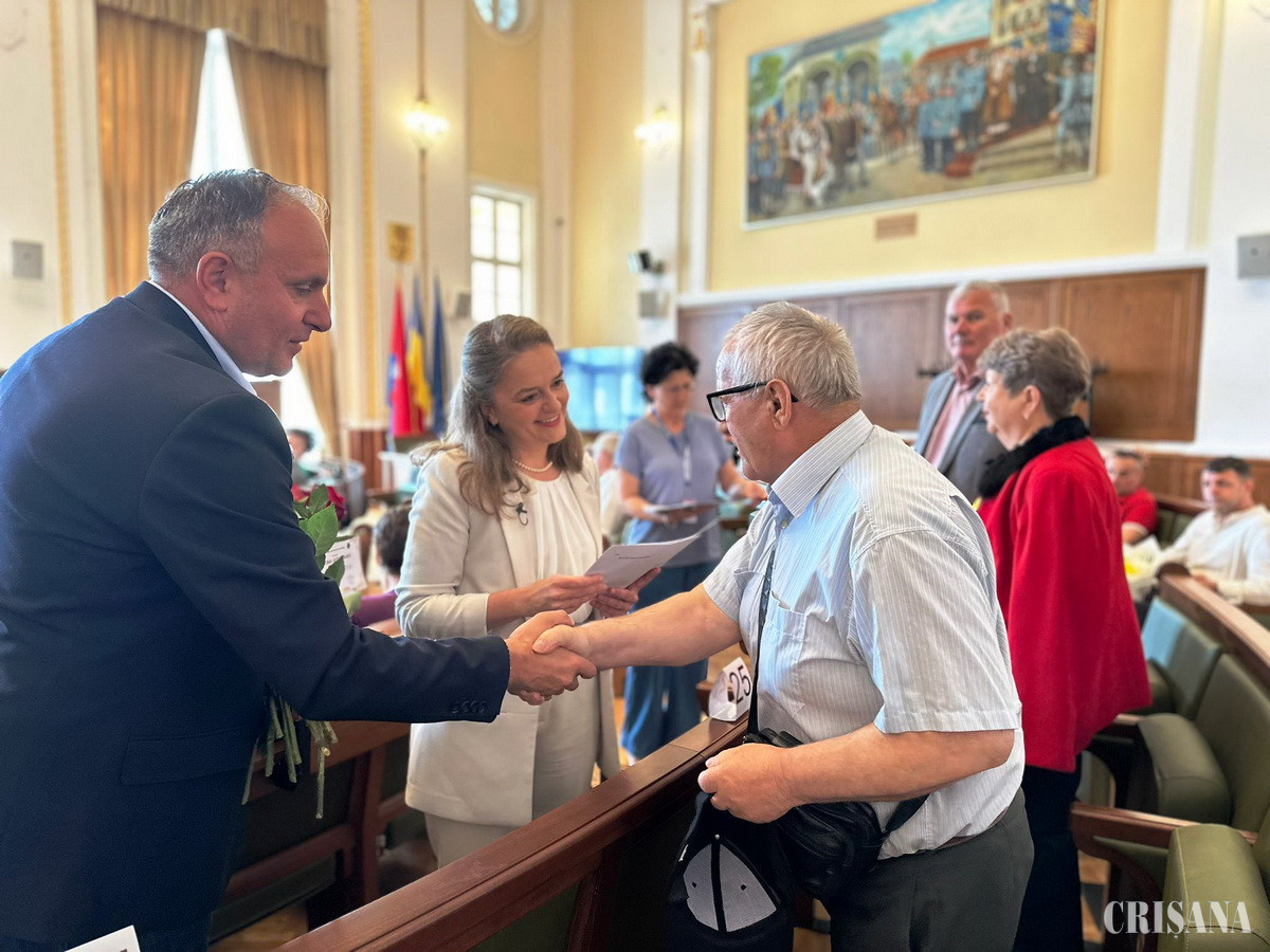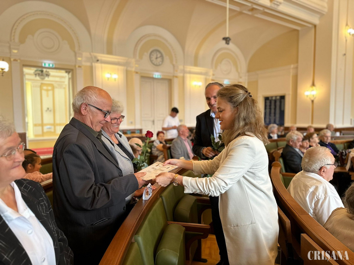 Viceprimarii Antonia Nica și Marcel Dragoș au felicitat miercuri, 22 mai, cele 29 de cupluri prezente în sala mare a Primăriei Oradea, la evenimentul „Nunta de Aur”.