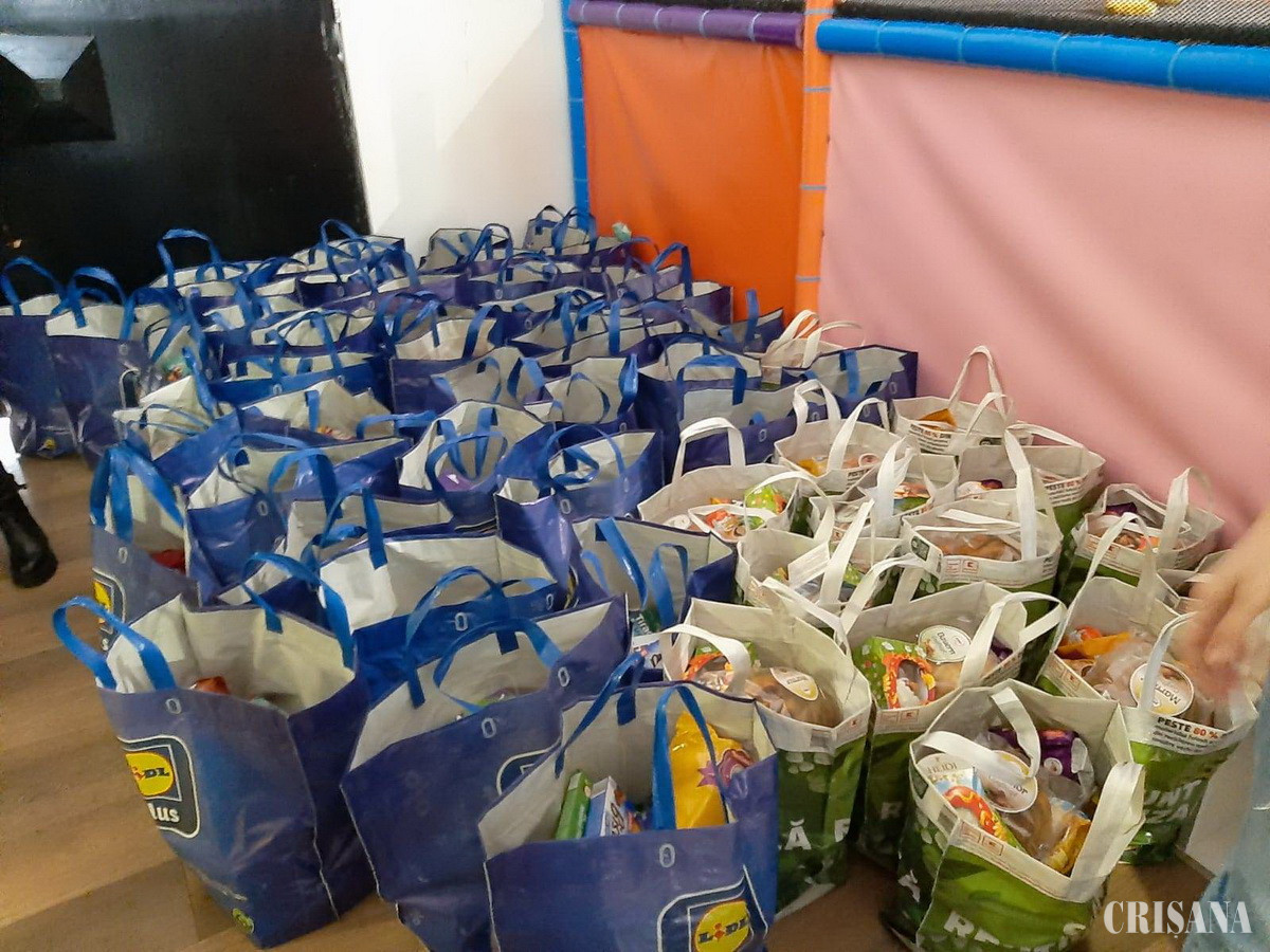 80 de pachete de alimente au fost distribuite marți, 11 aprilie, copiilor sărmani care au participat la petrecerea de la spațiul de joacă de la Casa de Cultură a Sindicatelor din Oradea.