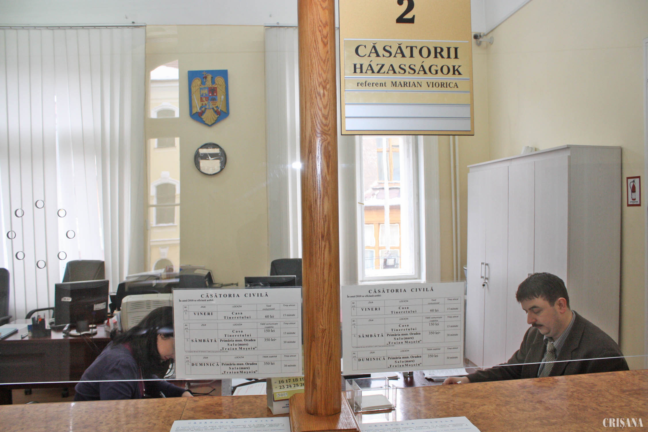 În acest an se vor putea încheia căsătorii civile vinerea, la Casa Tineretului din Cartierul Ioşia, sâmbăta - în Sala "Traian Moşoiu" a Primăriei municipiului Oradea şi la Casa Tineretului, respectiv duminica, în Sala "Traian Moşoiu" a Primăriei. În funcţie de solicitarea viitorilor soţi şi de posibilităţile tehnice pe care le poate oferi Serviciul de Stare Civilă, căsătoria se poate încheia şi în alte locuri, mai multe detalii putând fi obţinute la ghişeu.