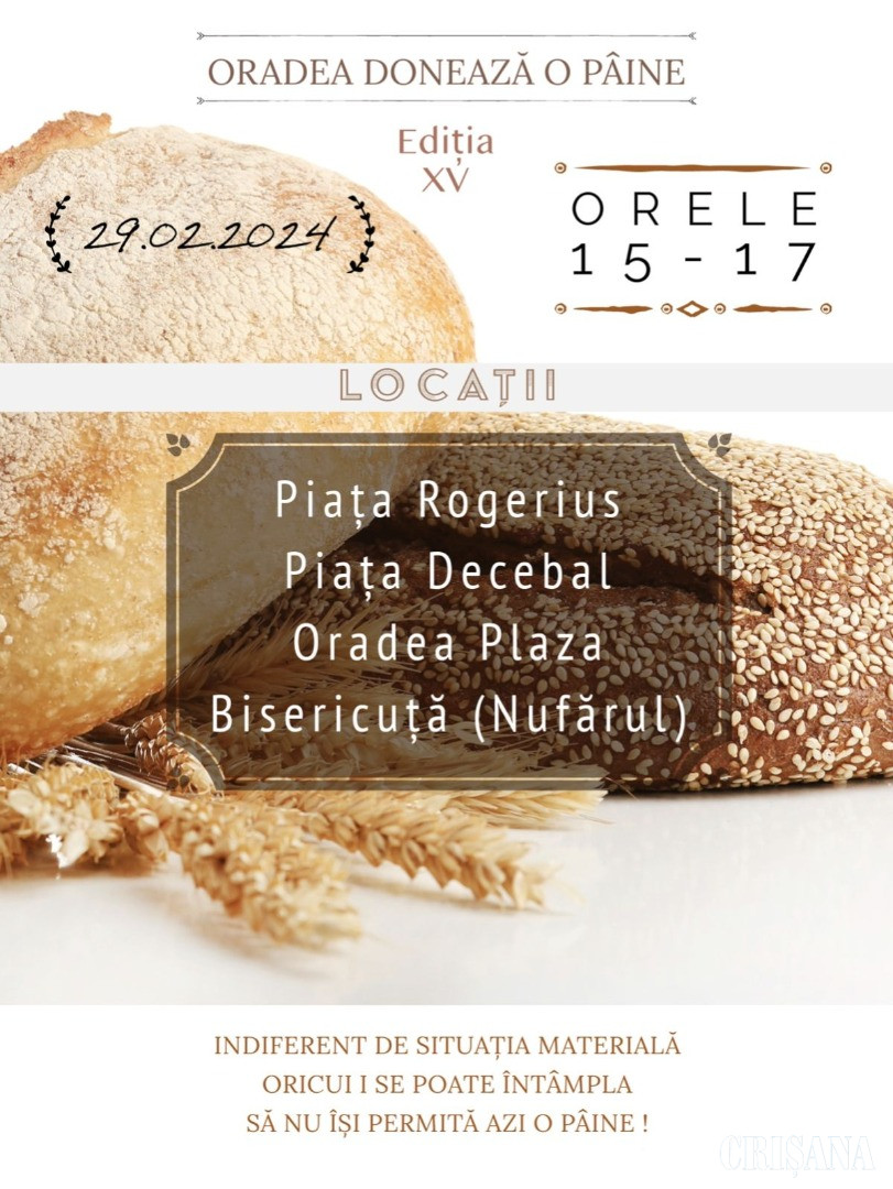 Prima ediție de după pandemie a proiectului „Oradea donează o pâine” va avea loc joi, 29 februarie, între orele 15.00-17.00. Punctele de distribuire vor fi: Piața Rogerius, Piața Decebal, Oradea Plaza, Bisericuță (Nufărul).