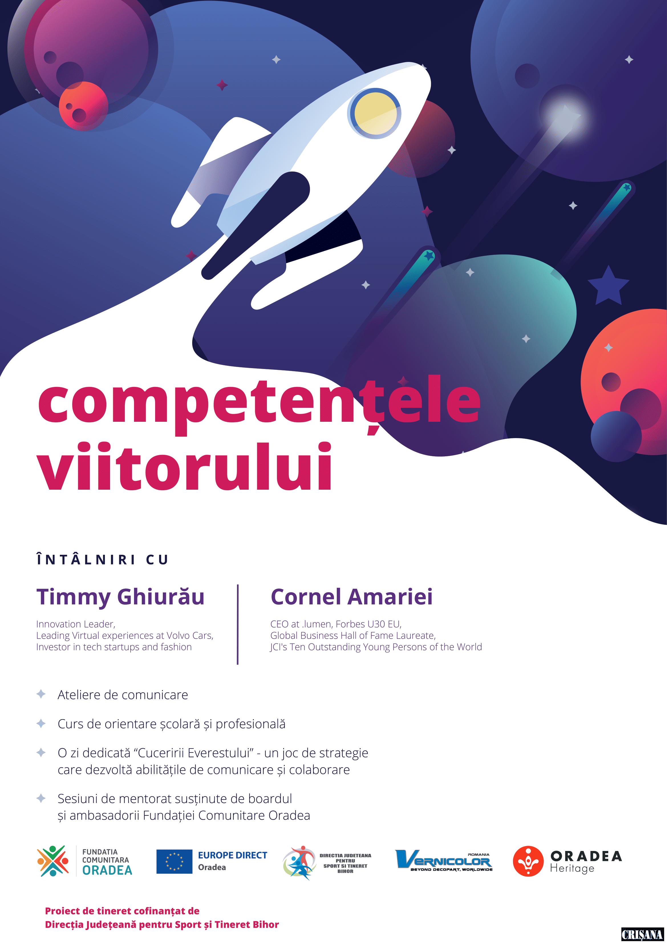 Competențele viitorului este un program de tineret confinanțat de Direcția Județeană pentru Tineret și Sport Bihor și este implementat cu sprijinul financiar al companiei Vernicolor, în parteneriat cu Oradea Heritage.