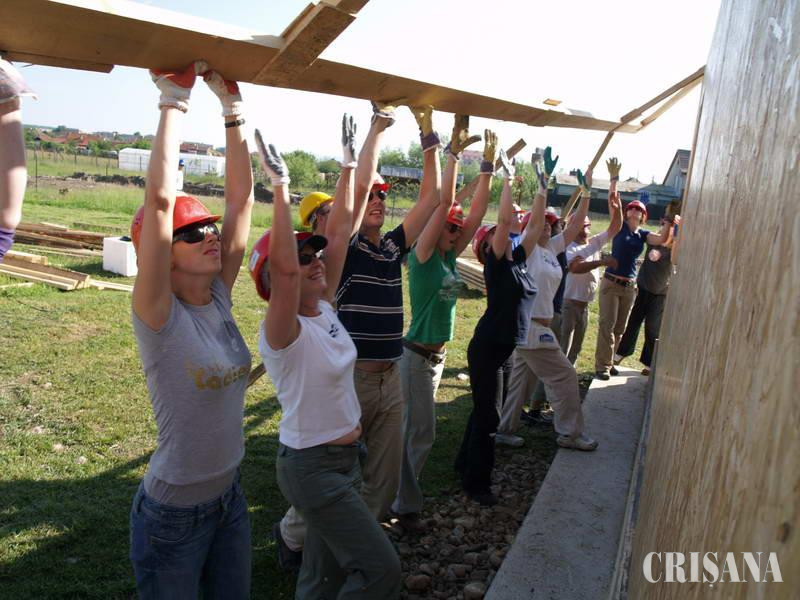 Luni a fost prima zi pe şantier, când cei 16 tineri au luat uneltele de muncă, şi-au pus casca de protecţie şi sub coordonarea specialiştilor de la Habitat pentru Umanitate Beiuş au început lucrul. În prima zi deja structura casei era în picioare, în timp ce ieri au finalizat acoperişul şi termoizolaţia. „Nu mă aşteptam ca în aşa scurt timp să progresăm atât de mult. Acest lucru mă face fericită, mai ales că văd bucuria şi pe faţa familiei care lucrează cot la cot cu noi. Deşi ştiam că va fi bine, chiar nu mă aşteptam la o experienţă atât de frumoasă", spune Inge, voluntară din Olanda. Cei trei membri ai familiei Sere locuiesc de 14 ani într-o garsonieră de 20 mp, într-un bloc de nefamilişti din Beiuş. Condiţiile sunt total improprii chiar şi pentru o singură persoană, cu atât mai mult pentru o familie. Toaleta este comună, la fel şi duşul, care nu mai funcţionează de ani buni. Vara este foarte cald pentru că pereţii sunt subţiri şi fără termoizolaţie, iar pe timpul iernii este foarte frig, pentru că soba din tablă a familiei nu face faţă după ce focul se stinge. „Este foarte greu să locuim aici, dar nu avem unde să mergem în altă parte şi nici nu putem să ne construim singuri ceva din puţinul pe care-l câştigăm. Sunt multe lucruri cărora le simţim lipsa pe lângă spaţiu, iar cel mai mult ne lipseşte o baie. Acum ne spălăm pe rând într-un lighean, iar pentru o familie cu un copil e foarte greu", mărturiseşte Catiţa Sere, beneficiara casei. Voluntarii au venit la Beiuş prin intermediul biroului Habitat for Humanity din Olanda, care recrutează echipe de voluntari din ţară ce ajută apoi familii nevoiaşe din toată lumea. Anual 25 de echipe de olandezi construiesc case, din care două sau trei vin în România. Este şi cazul echipei de la Beiuş, care a dorit să vină în sprijinul familiei Sere, după ce i-au aflat povestea de la Habitat pentru Umanitate Beiuş. „Cei mai mulţi voluntari sunt de la companii, în procent de 75%, dar sunt şi biserici, şcoli sau familii care vor să aniverseze ceva alături de prieteni într-un mod inedit. În cazul de faţă e vorba de o firmă de consultanţă, Dutch, care are 80 de angajaţi, majoritatea implicaţi în proiecte sociale, cum e şi cazul de faţă", susţine Mirjam Pronk, coordonatoarea echipei de voluntari şi angajată a Habitat for Humanity Netherlands.