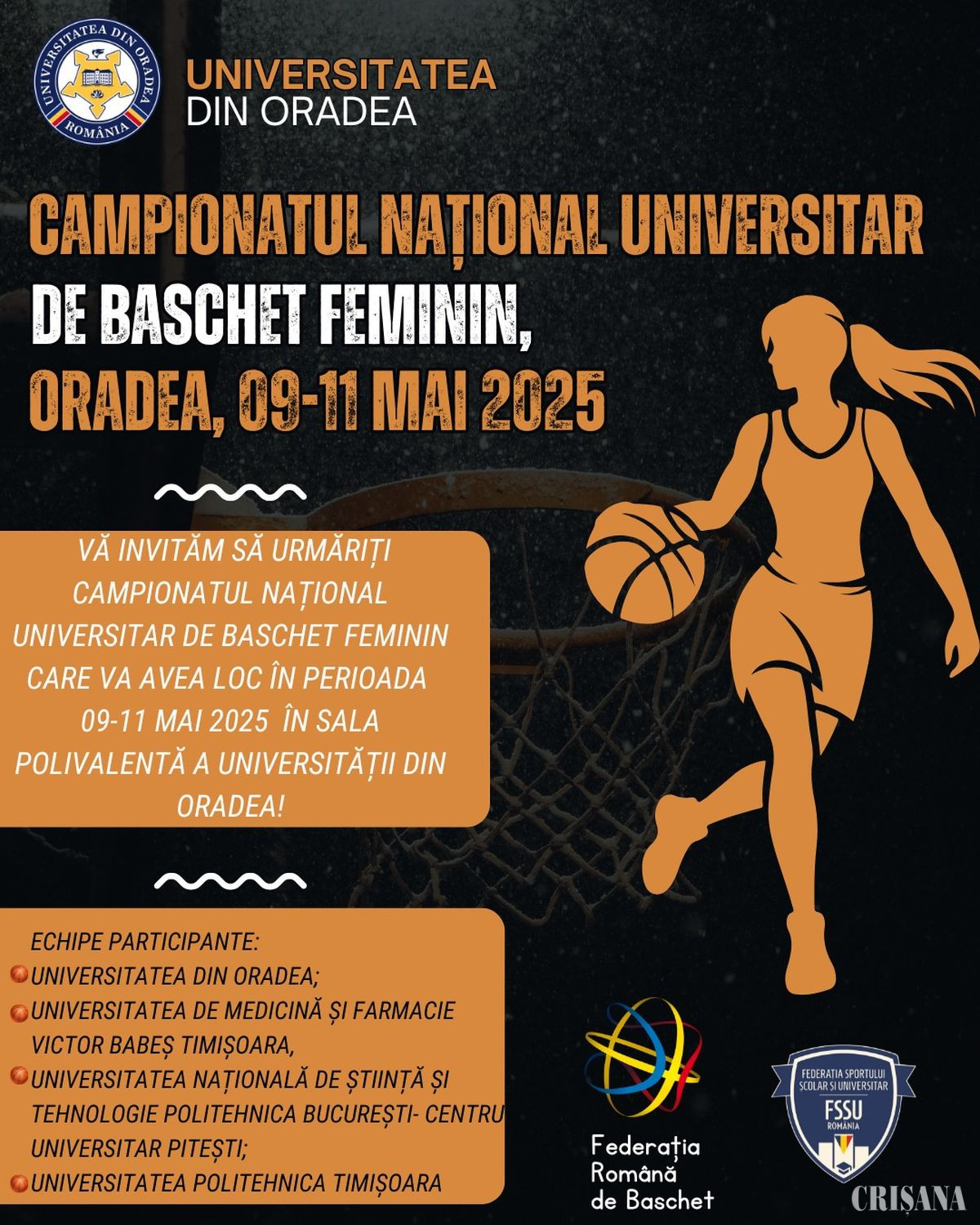 Pentru al doilea an consecutiv, Oradea găzduiește turneul final al Campionatului Național Universitar de baschet feminin, competiție organizată de Federația Sportului Școlar Universitar, în parteneriat cu Universitatea din Oradea și Federația Română de Baschet.