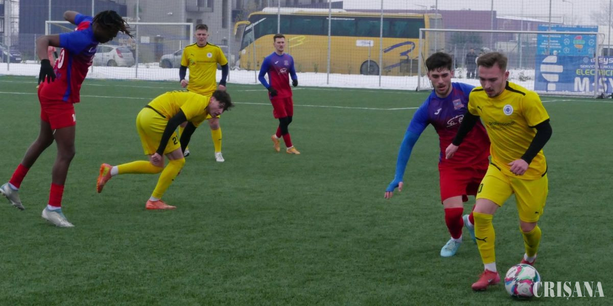 Cât timp a jucat cu formula de start, Crișul a fost echipa mai bună, marcând la jumătatea primei părți dintr-o lovitură de la 11 metri transformată de Vlad Costea (0-1). Până la pauză, sătmărenii au reușit să egaleze după un șut de la 16 metri al lui Alex Militaru (32, 1-1), pentru ca în partea secundă Florin Chitaș (70) să puncteze dintr-o lovitură de la 11 metri (2-1)
