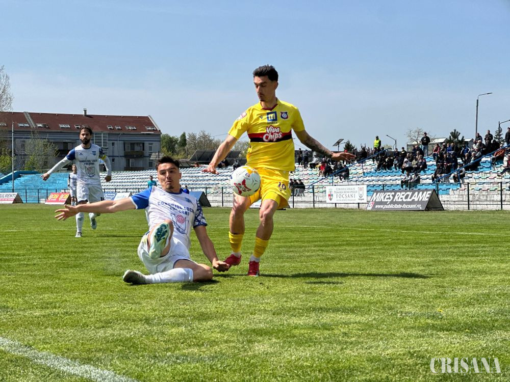 Roş-albaştrii au cu şapte puncte mai mult în clasament faţă de echipa din Focşani, care mai are de disputat doar două jocuri şi nu mai are cum să ajungă formaţia orădeană. Jocul de la Stadionul Milcovul nu a fost început însă tocmai bine bihoreni, care s-au văzut conduşi din minutul 7, dar în partea a doua roş-albaştrii au revenit, au evoluat mai bine şi au înscris golul egalizator, prin Răzvan Gunie, în minutul 63.