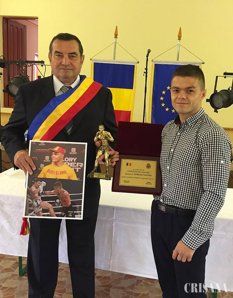 Pe lângă succesele din ring, luptătorul bihorean Adrian Maxim a mai avut recent un motiv de satisfacţie. Sportivul în vârstă de 29 de ani a fost declarat cetăţean de onoare al comunei Girişu de Criş în cadrul unei festivităţi organizate la căminul cultural din localitate.