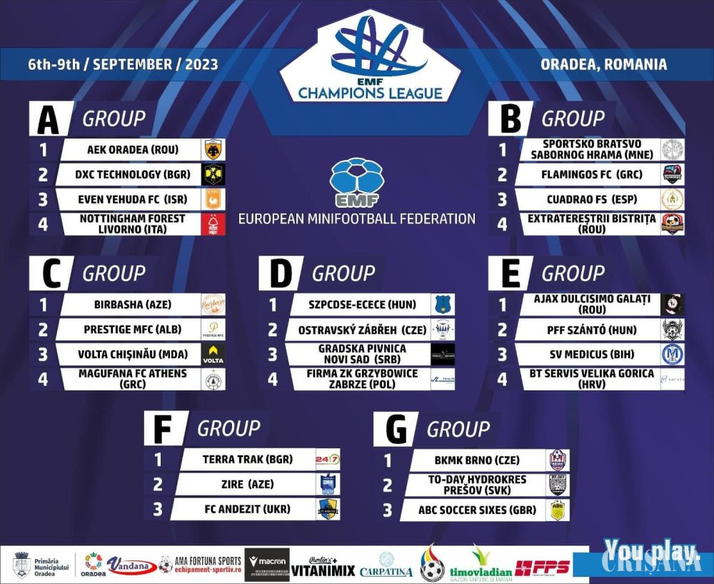 De la ora 21.00 va juca AEK Oradea, campioana europeană en-titre, cu italienii de la Nottingham Forest Livorno. Din Grupa A mai fac parte vicecampioana Bulgariei, DXC Technology și campioana Israelului, FC Even Yehuda (Israel). Joi, 7 septembrie, de la ora 12.00, orădenii vor continua cursa de păstrare a trofeului, urmând să se confrunte cu FC Even Yehuda, pentru ca în aceeași zi, de la ora 20.00, urmând să întâlnească DXC Technology. Primele două clasate din grupă, precum și cele mai bune două locuri 3 se vor califica în faza eliminatorie. Managerul Spiros Baltsavias va aborda turneul final cu Răzvan Egri, Călin Fildan - portari; Mircea Popa, Marius Balogh, Andrei Ferik, Cristian Andor, Bogdan Mintaș, Andrei Nemițanu, Sabin Dristaru. Radu Burciu,Toma Vincene, Andrei Șumălan și Răzvan Fărcuța, Marius Ionescu, Sergiu Matei-Țurcanu și Ionuț Furtună.