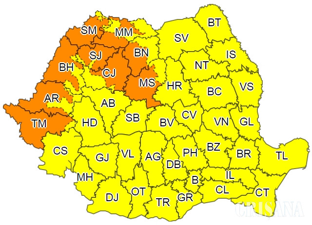 Potrivit ANM, sunt vizate de Codul portocaliu județele Satu Mare, Bihor, Arad, Timiș, Maramureș, Sălaj, Cluj, Bistrița-Năsăud și Mureș.