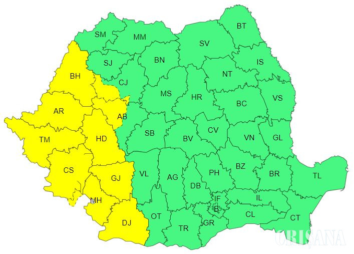 Sunt vizate de avertizarea de instabilitate atmosferică județele Bihor, Cluj, Alba, Hunedoara, Arad, Timiș, Caraș-Severin, Mehedinți și Dolj.