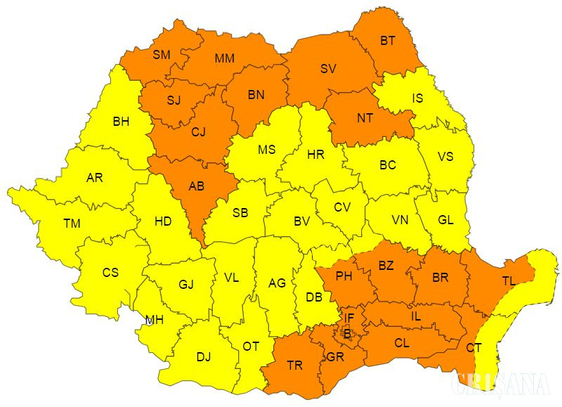 Aceste județe se vor afla sub avertizare Cod portocaliu, iar restul țării sub avertizare Cod galben.