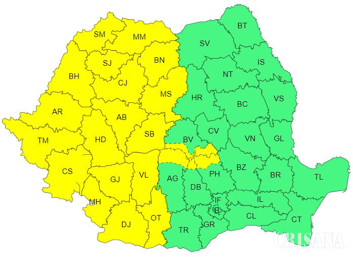 O avertizare Cod galben, valabilă de luni de la ora 20.00 până marți la ora 8.00 vizează județele Satu Mare, Maramureș, Bistrița-Năsăud, Mureș, Cluj, Sălaj, Bihor, Alba, Sibiu, Arad, HUnedoara, Timiș, Caraș-Severin, Gorj, Mehedinți, Dolj, Olt, Vâlcea, precum și zone din județele Brașov, Argeș, Dâmbovița, Prahova și Covasna.