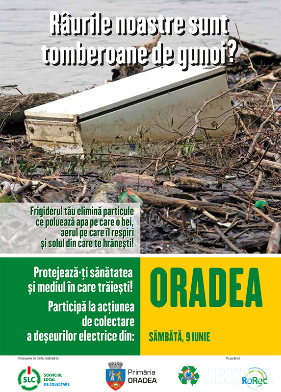 Sâmbătă, 9 iunie, va avea loc acţiunea lunară de colectare a deşeurilor de echipamente electrice şi electronice. Cei care predau deșeuri de acest tip vor participa la o tombolă cu premii, care se va organiza luni, 11 iunie, ora 11.00, în Sala Mare a Primăriei Oradea.