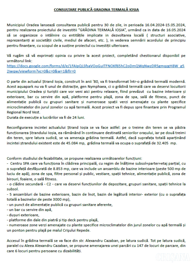 Municipiul Oradea lansează consultarea publică pentru 30 de zile, in perioada 16.04.2024-15.05.2024, pentru realizarea proiectului de investitii “GRĂDINA TERMALĂ IOȘIA”, urmând ca in data de 16.05.2024 să se organizeze o intâlnire cu entitățile implicate in dezvoltarea locală ( structuri asociative, reprezentanți ai societății civile, mediul de afaceri, etc. ), in vederea semnării acordului de principiu pentru finanțare, cu scopul de a susține proiectul cu investiții ulterioare.