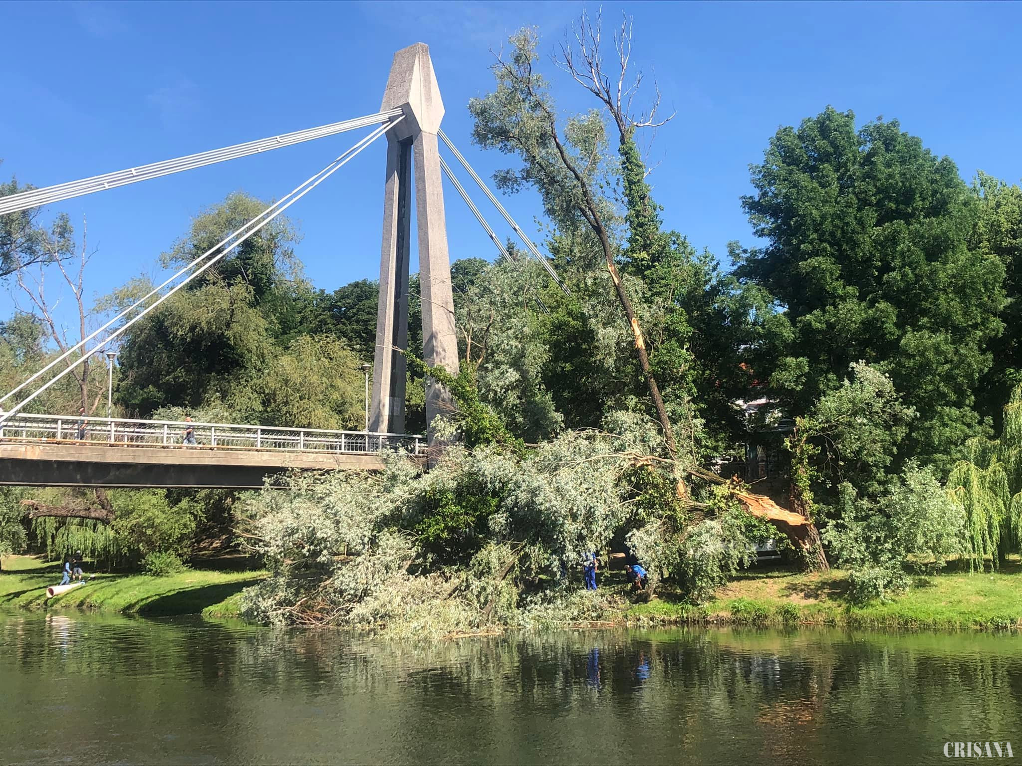 Furtuna din ultimele zile a doborât trei copaci pe malul drept, în zona Podului Intelectualilor. Echipele ABA Crișuri sunt în teren pentru a degaja resturile vegetale.